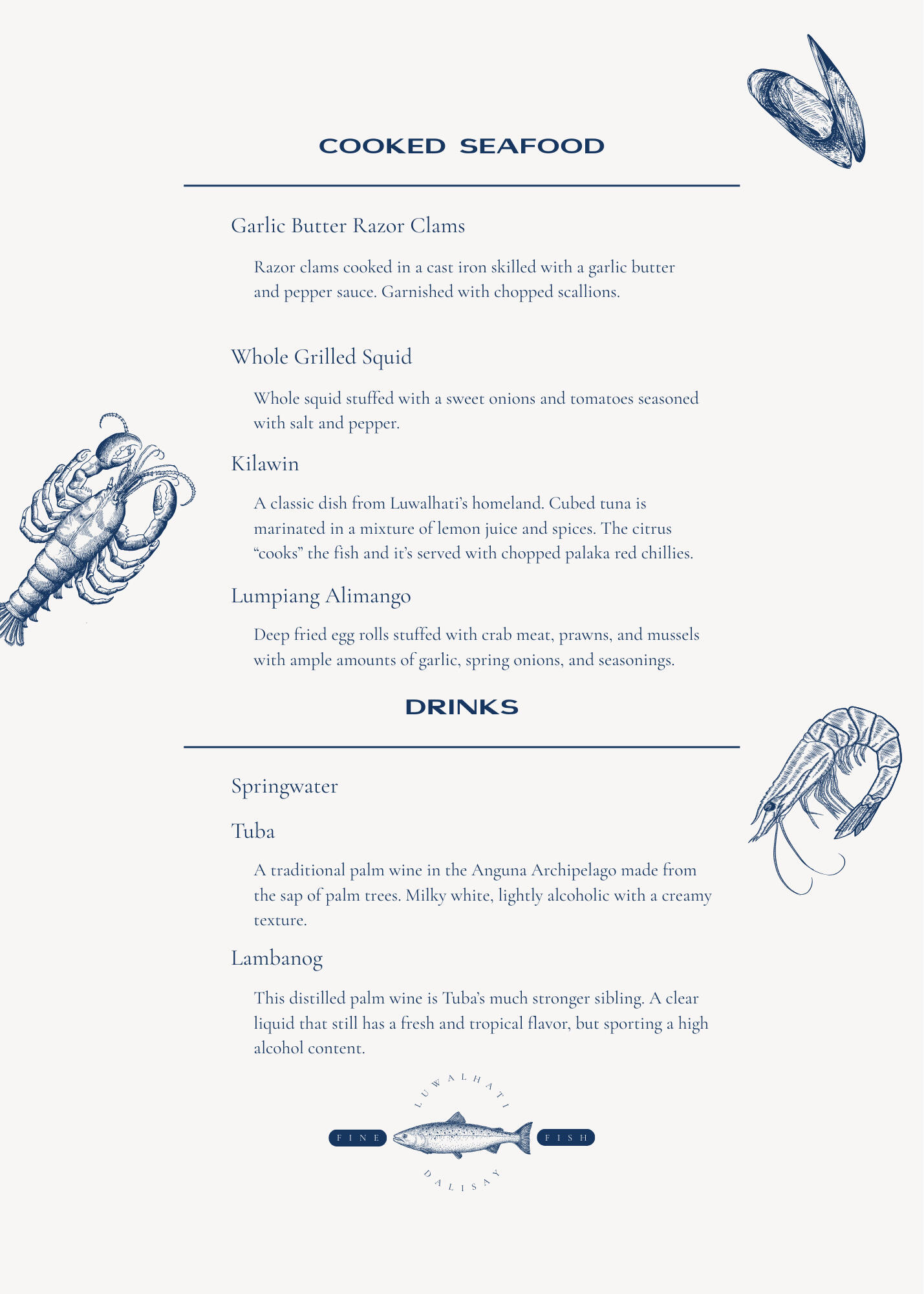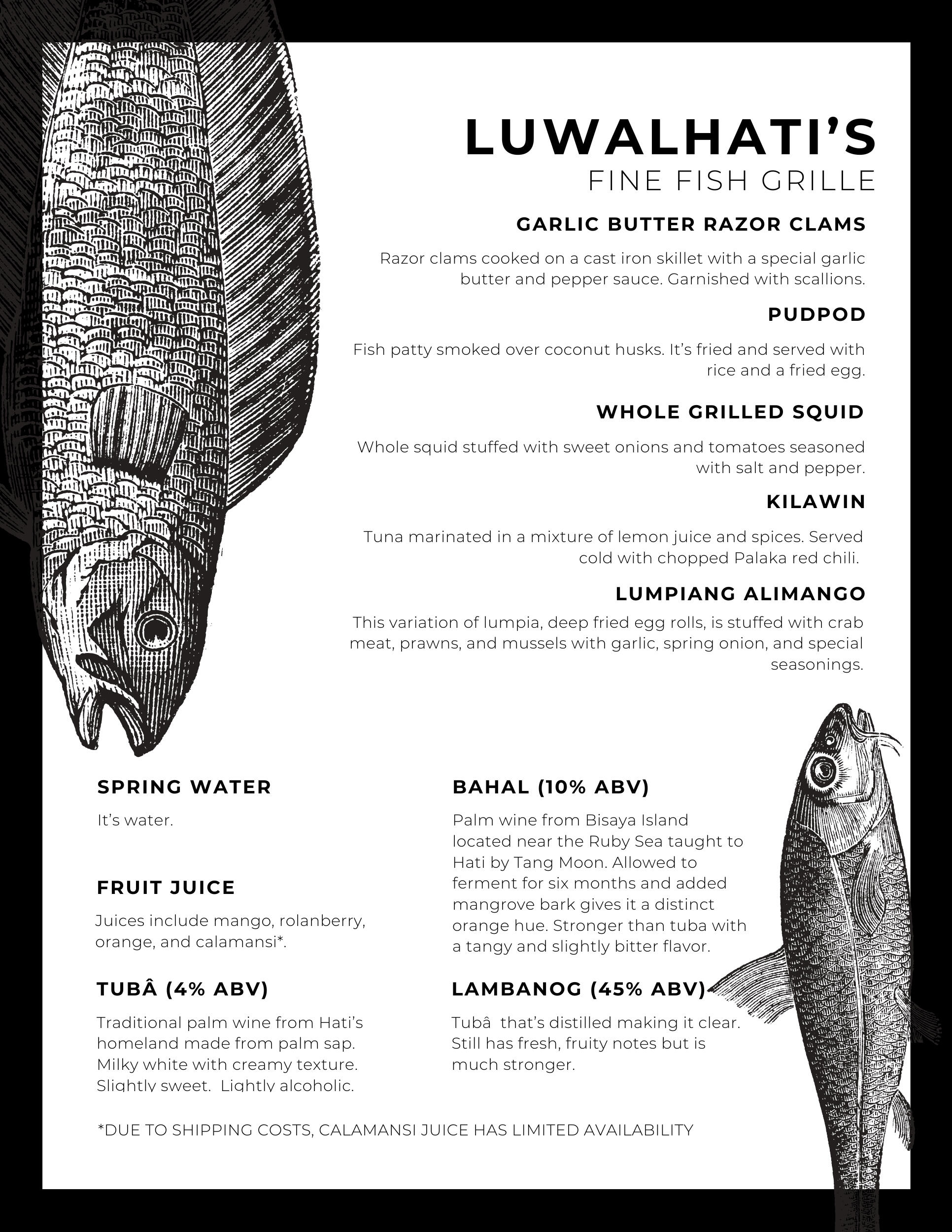Owing to a sudden surfeit of fish, Luwalhati has decided to share the bounty of the sea by offering up her catches to those looking for fresh seafood. Her stock includes both fresh fish as well as a variety that are smoked or salted. For those looking for a bite to eat, Luwalhati has an eatery with dishes from her homeland on offer as well as specialty palm wines that are made on site.Luwalhati also has fishing gear and bait for sale. Ask her about it!